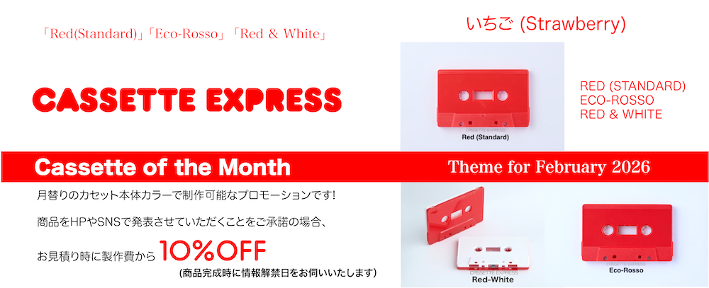 Simply changing the cassette’s body color dramatically transforms the work’s image! If you place an order for cassette production based on the theme specifications and agree to allow us to announce the finished product on our related websites and SNS after the information is released, we will offer a 10% discount on the production at the time of quotation. Promotion period runs until February 28th,2026.