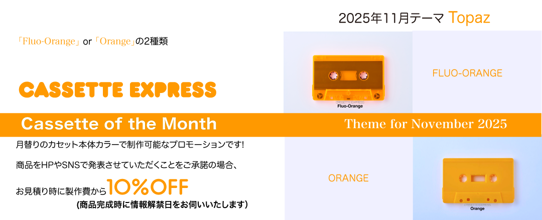 月替わりの「テーマ」本体カラーでカセットテープ製作をご発注いただき、商品完成後にHPや関連サイト、SNSで発表させていただく可能性をご承諾・同意の場合、お見積り時に通常進行の製作費から10%割引させていただきます(事前にお客様のリリース情報解禁日をお伺いします)。また、約2〜3週間の短納期で進行いたします。