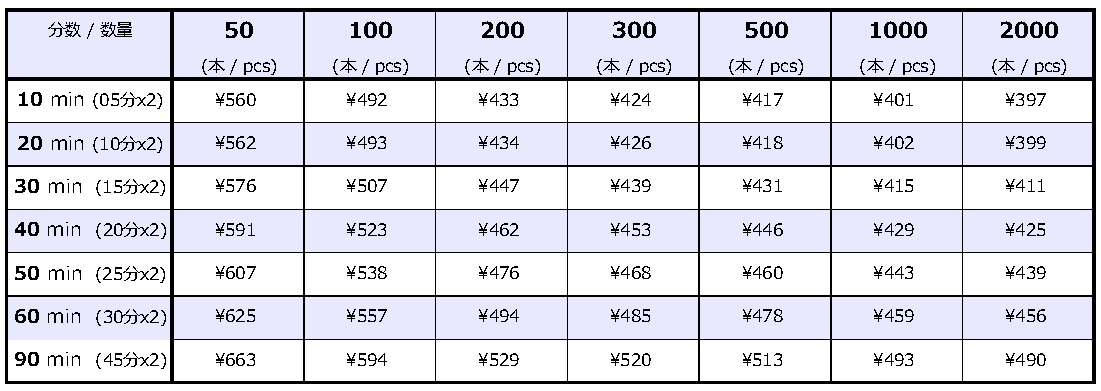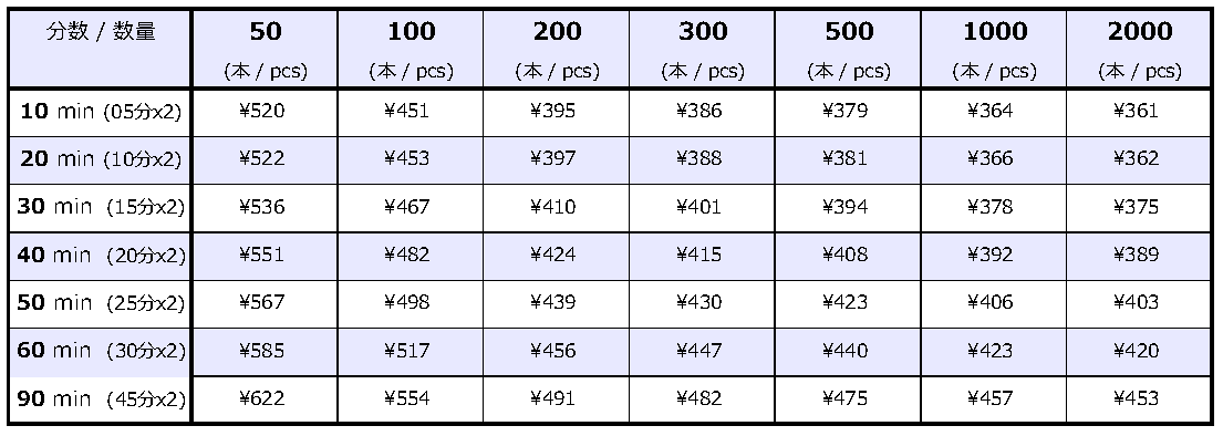 ※オールインワン税抜単価 (カセット本体/収録/標準J-Card/レーベル印刷/Pケース/キャラメル包装/送料本州1ヶ所込)
