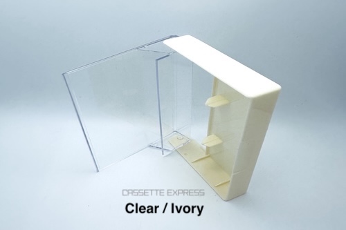 For cassette plastic cases, in addition to the standard clear/clear front and back panels, we offer various colored plastic cases at an optional price. Options include solid opaque colors with a clear back, translucent clear colors, fluorescent colors that glow under black light, a pinless (No Pin) specification usable for items other than cassettes, and 2-pack or 3-pack configurations.