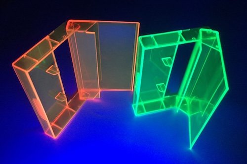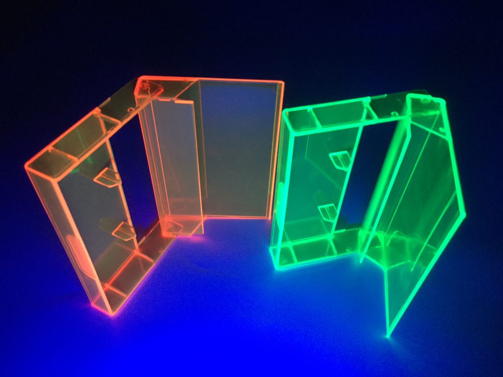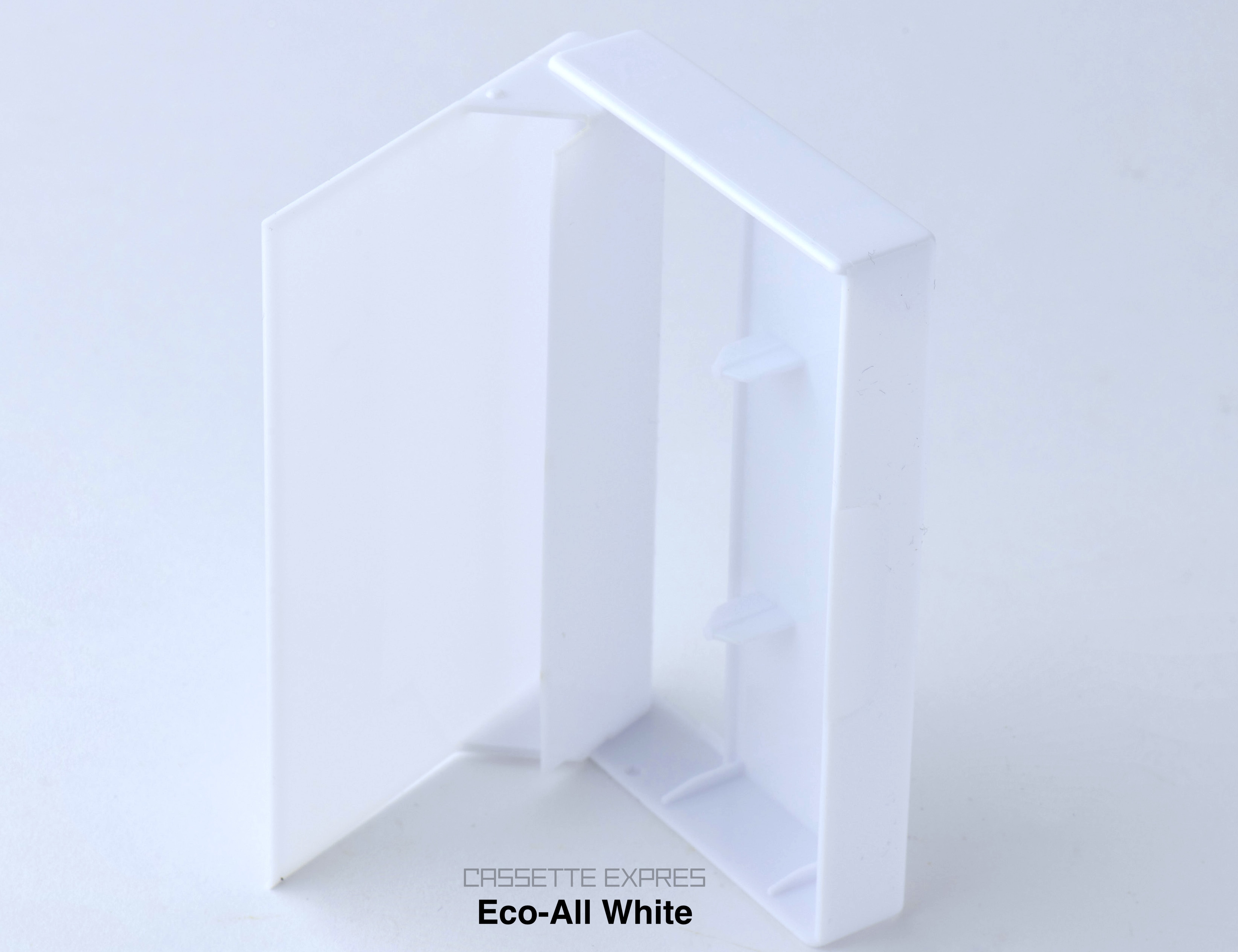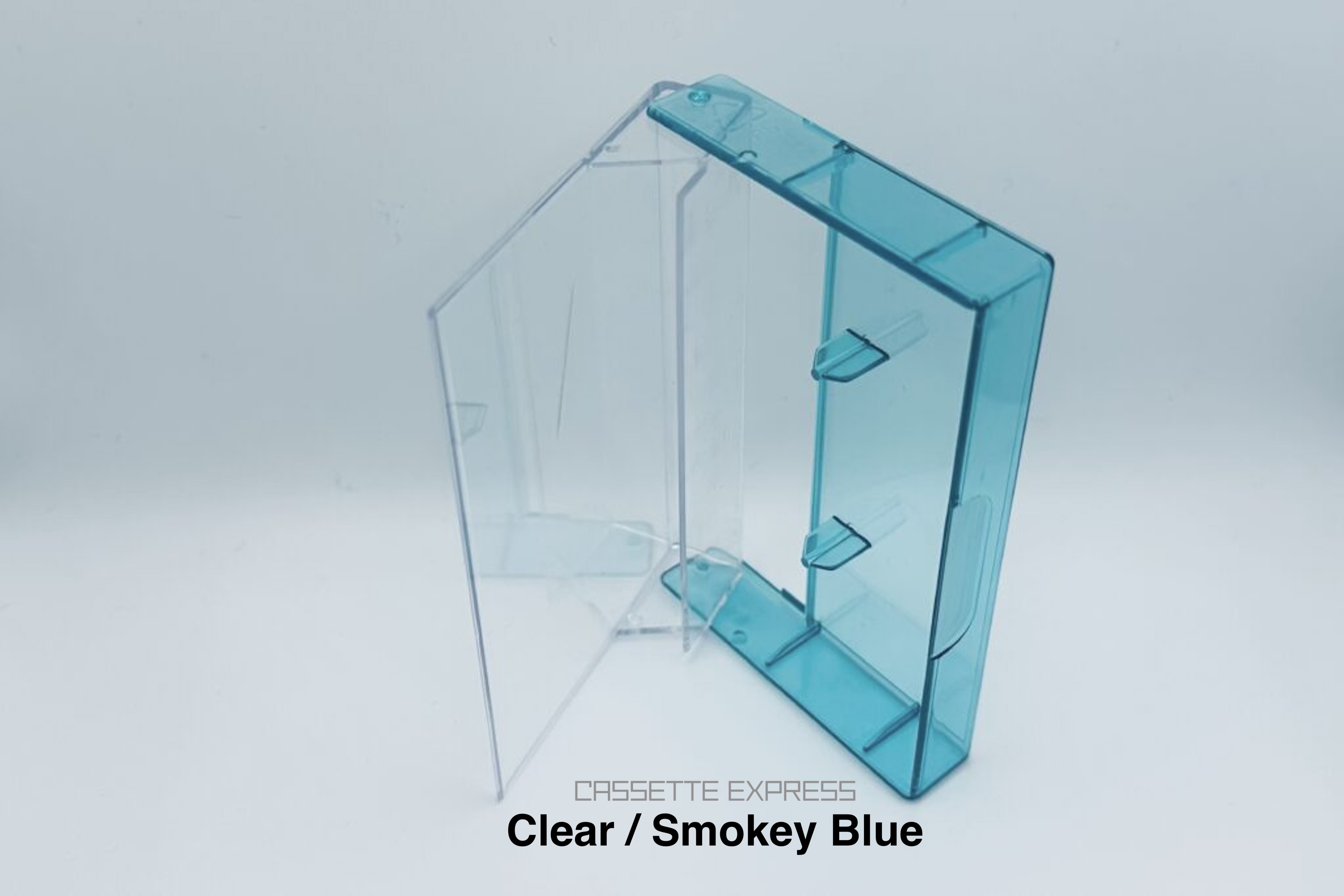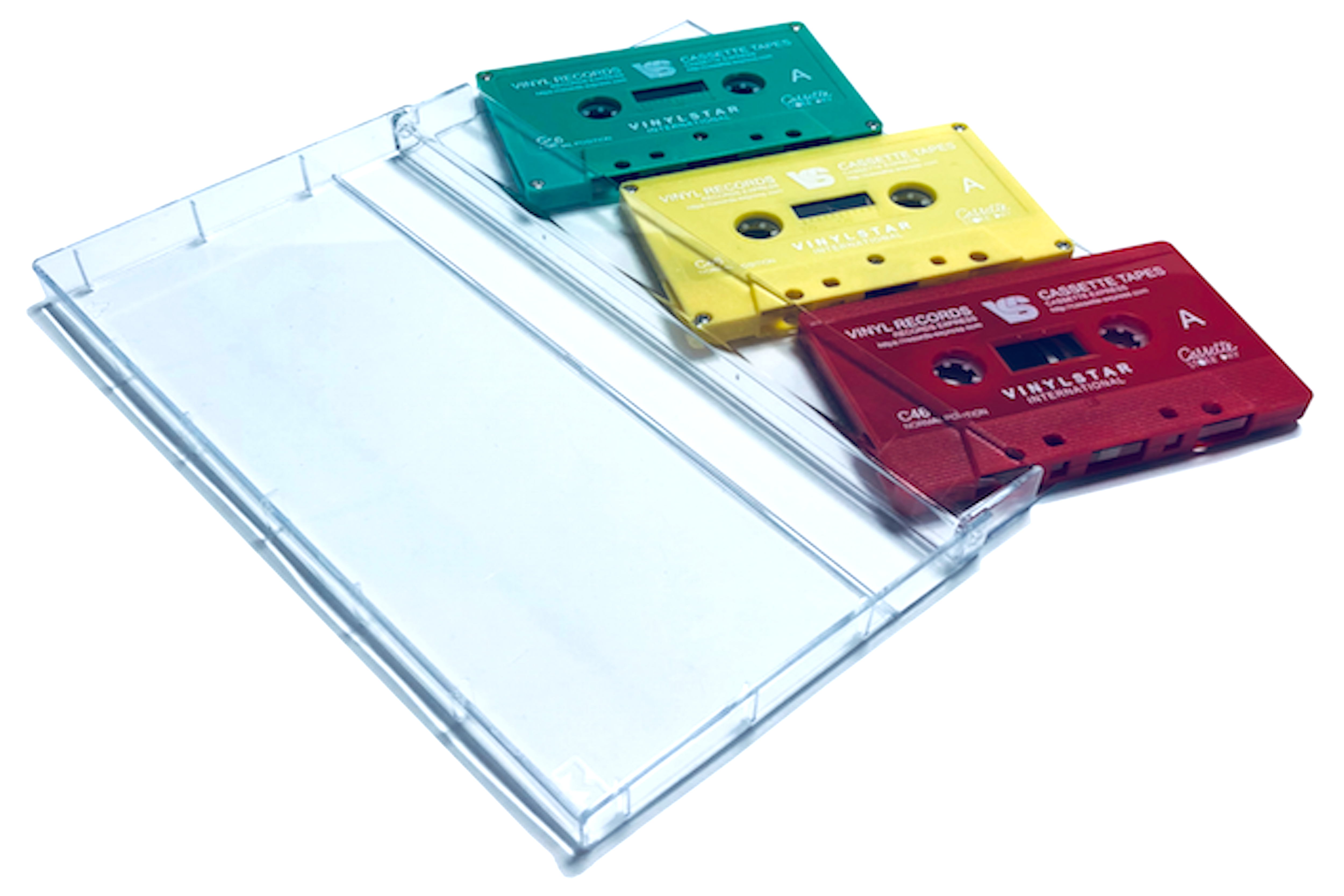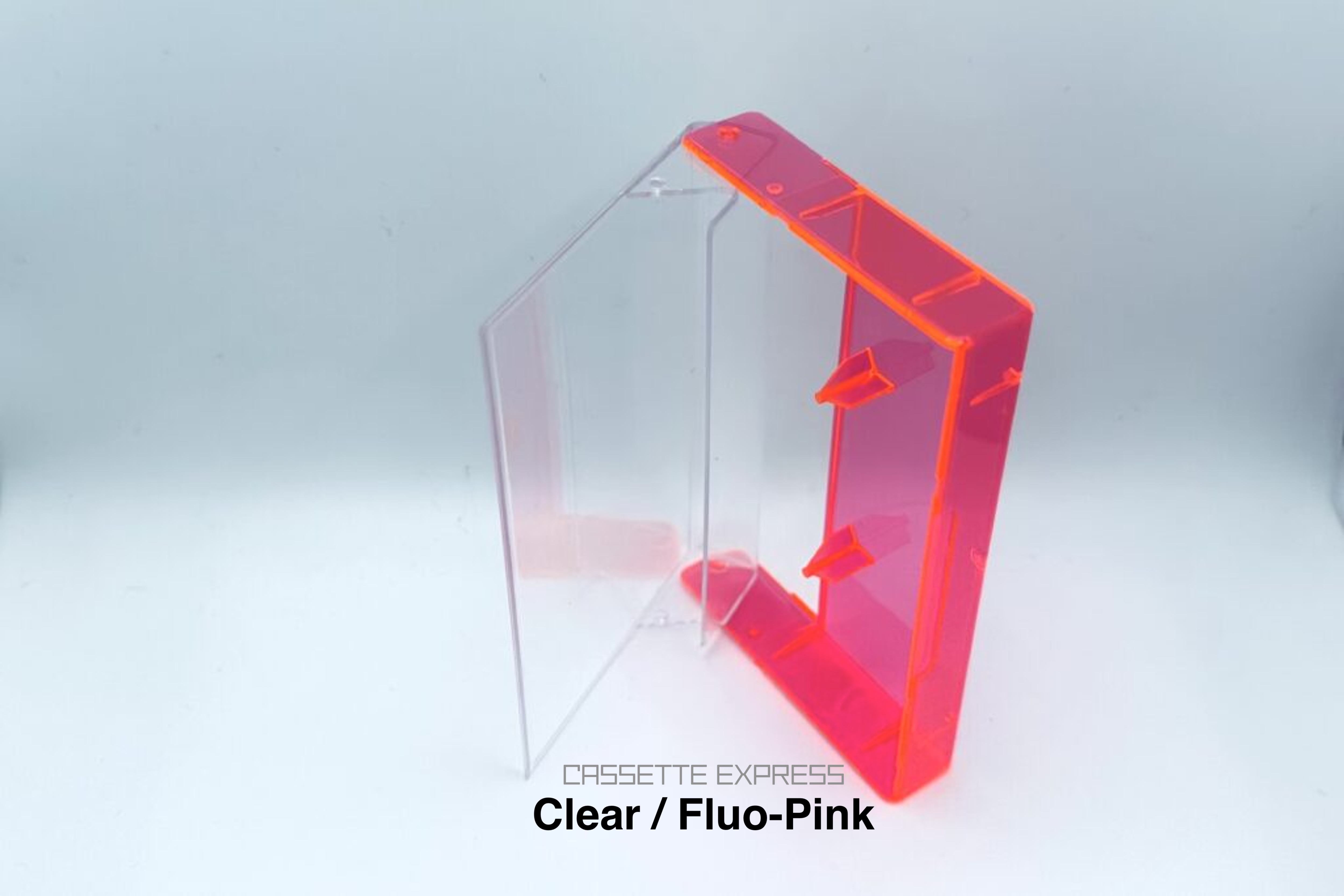 For cassette plastic cases, in addition to the standard clear/clear front and back panels, we offer various colored plastic cases at an optional price. Options include solid opaque colors with a clear back, translucent clear colors, fluorescent colors that glow under black light, a pinless (No Pin) specification usable for items other than cassettes, and 2-pack or 3-pack configurations.