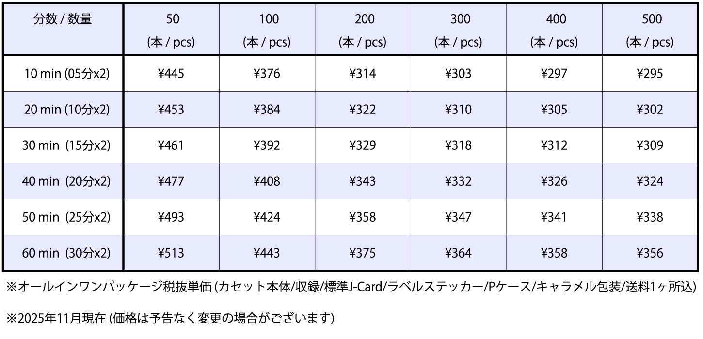 For projects such as “I need to make a cassette tape urgently, but there’s not much time until the release date!” or “I need to get it ready in time for my next live performance!”, we offer “EXPRESS (fast & low-cost) color” printing, which significantly reduces production costs by limiting the specifications. It supports both Paper Labels and Direct On-Body Prints, and is an all-in-one package recommended for those making cassette tapes for the first time! For small lots of 500 or less, only J-CARD jackets are available. Manufacturing takes about 7-10 business days(*). Large lots are also possible (additional days may be required). (*) Begins after form and complete data are submitted and payment is received (proof confirmation not included).